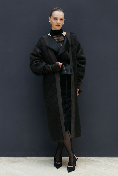 A warm fluffy mohair oversized coat tailored in special kimono oversized shape. Coat front finishing is made by plant based sustainable vegan leather look fabric